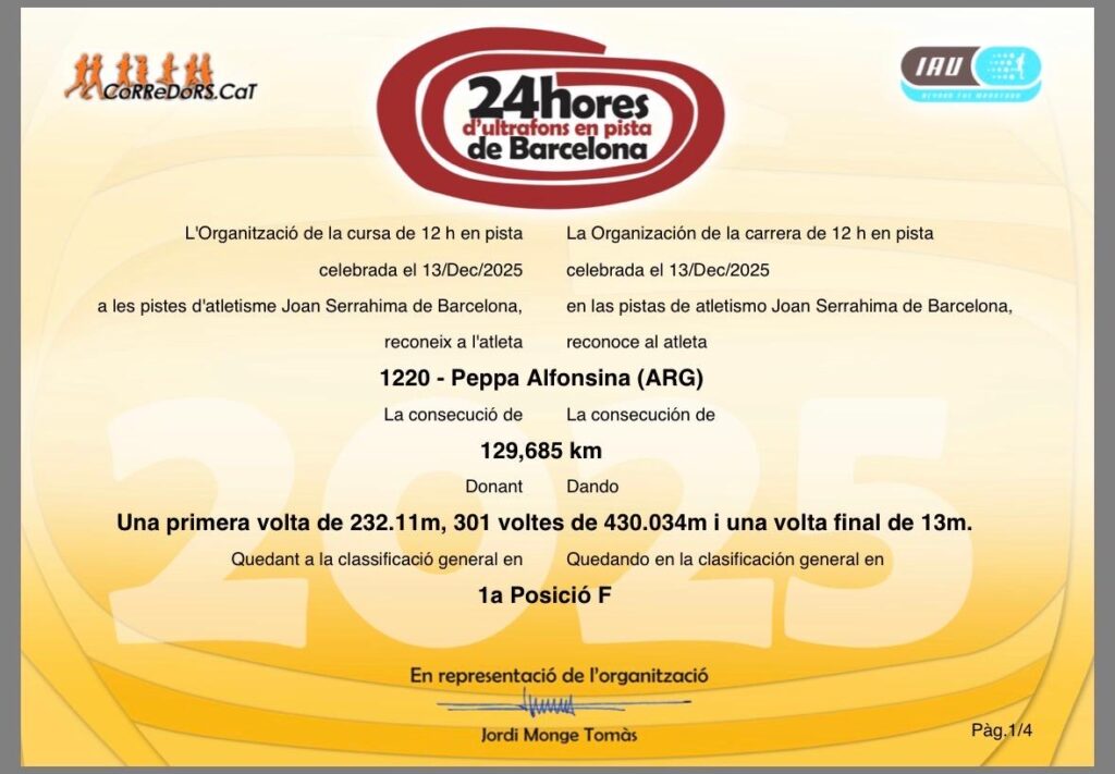 La organización de la carrera de 12 horas en pista, celebrada el 13 de diciembre de 2025 en las pistas de atletismo Joan Serrahima de Barcelona, ha reconocido la actuación de la atleta de Lloret, Alfonsina Peppa (ARG), que completó un total de 129,68 kilómetros y finalizó la competición en 1.ª posición femenina de la clasificación general.