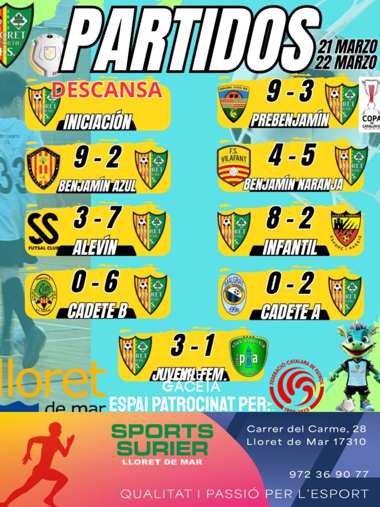 El cap de setmana va deixar sensacions diverses per als equips base del Lloret Esportiu: el Prebenjamí blau va caure a la Copa Catalunya (1-3) tot i competir amb intensitat i bona actitud, mentre que el Benjamí blau també va perdre per la mínima (2-3) en un duel on va merèixer més però la manca d’encert li va passar factura; en canvi, el Benjamí taronja va sumar una gran victòria (5-2) amb un Romeo estel·lar autor d’un hat-trick, i l’Aleví va imposar el seu potencial ofensiu (6-3) liderat per un Marc inspirat amb quatre gols; l’Infantil va complir amb solvència davant el Vidreres (4-1), consolidant-se a la part alta, mentre que el Cadet A va signar una victòria de prestigi a la pista del líder (2-3), retallant distàncies en la classificació, i el Cadet B va dominar amb autoritat (5-1) per mantenir-se en la segona posició; finalment, el Juvenil Femení va completar un partit vibrant i va acabar imposant-se (3-2) gràcies al seu caràcter i determinació en els moments clau.