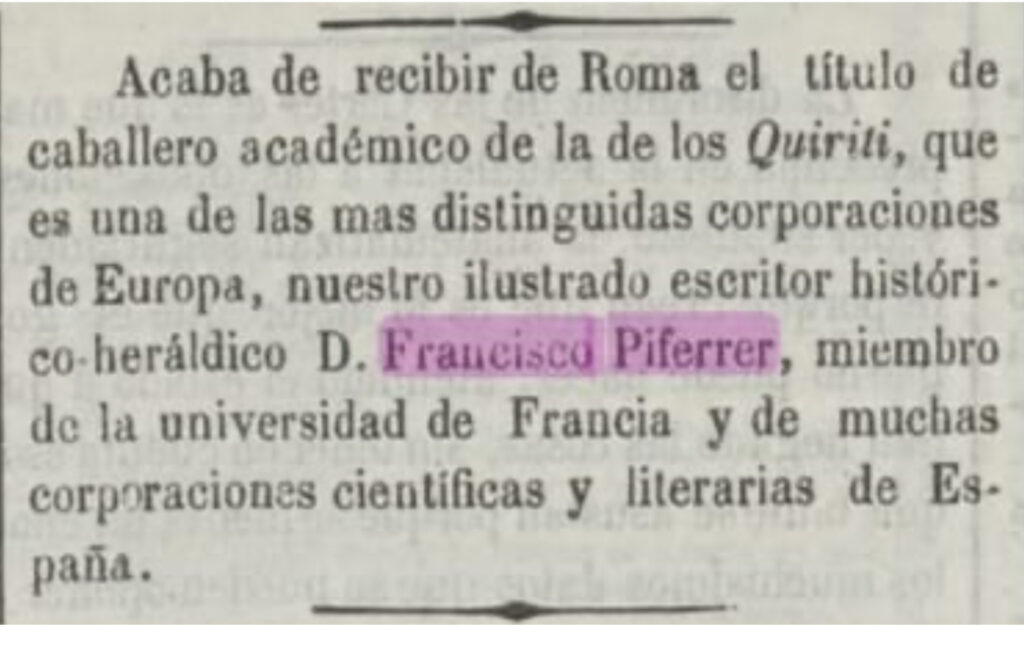 Por el Diario La Verdad (Madrid. 1860). 21/2/1863 que se conserva en la Biblioteca Nacional de España (BNE): “(…) Acaba de recibir de Roma el título de caballero académico de la de los Quiriti, que es una de las mas distinguidas corporaciones de Europa, nuestro ilustrado escritor histórico-heráldico D. Francisco Piferrer, miembro de la universidad de Francia y de muchas corporaciones científicas y literarias de España”.