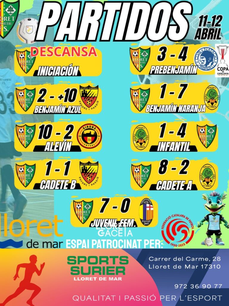 Lloret Esportiu Futbol Sala: El prebenjamí va caure en un partit molt igualat (derrota 3-4) decidit en els últims compassos després d’un gran esforç, mentre que el benjamí blau també va perdre (2-+10) tot i oferir una molt bona imatge dominant fases del joc i generant ocasions que no es van transformar en gol; el benjamí taronja va caure 1-7 però va aconseguir classificar-se per a la següent ronda, premi al treball i la constància de l’equip, l’aleví va signar una victòria contundent 10-2 en un partit dominat de principi a fi amb gran connexió entre línies i eficàcia ofensiva, l’infantil va sumar un triomf molt important a la pista del Ripoll (2-4) que el manté en la lluita pel títol de lliga, el cadet B va empatar 1-1 davant el líder en un duel intens i molt competit amb opcions fins al final, el cadet A va aconseguir una victòria còmoda 8-2 també davant el Ripoll consolidant el seu bon moment de forma, i el juvenil femení va tancar la jornada amb una victòria molt sòlida 7-0 mantenint la porteria a zero i mostrant un gran nivell col·lectiu que reforça la confiança de l’equip de cara al tram final de temporada.