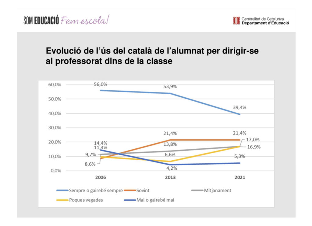 Pel que fa a l’evolució de l’ús del català del professorat per dirigir-se a tot el grup, també hi ha hagut una disminució, ja que al 2006 el 63,7% del professorat s’adreçava al seu grup en català sempre o gairebé sempre, i al 2021 la dada ha minvat fins el 46,8%.