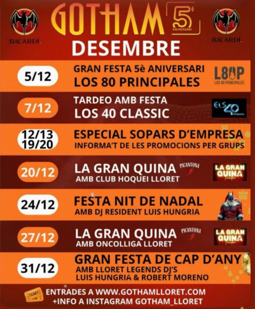Las entradas de todas las actividades ya están a la venta en www.gothamlloret.com y toda la información adicional se puede seguir en Instagram: @gotham_lloret. Diciembre en Gotham no viene fuerte: viene imparable.