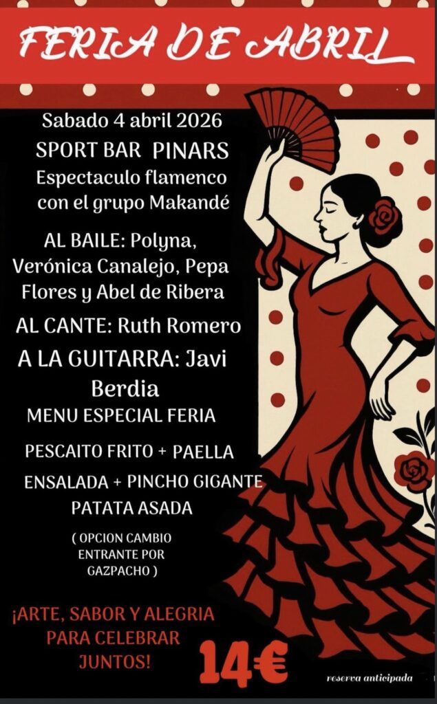 El primer encuentro será en el Sport Bar de la urbanización de Els Pinares, a partir de las 12:30h. Allí, el grupo Makandé pondrá ritmo al espectáculo de flamenco con Polyna, Verónica Canalejo y Pepa al baile, Ruth Romero al cante y Javi Berdia a la guitarra. Flores y Abel de Ribera completan un cartel cargado de arte y energía. Además, habrá un menú especial Feria que incluye pescaíto frito, paella, ensalada, pincho gigante, patata asada y gazpacho por 14€ con espectáculo. Para no quedarse sin plaza, se recomienda reservar con antelación al 674 57 29 76.