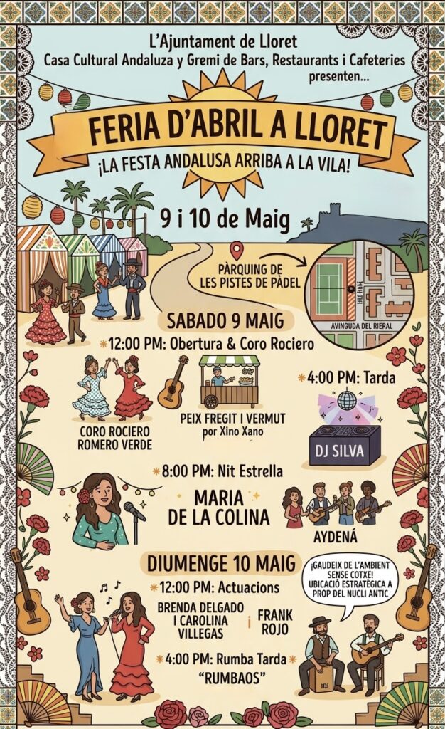 Ya en mayo, el Ayuntamiento de Lloret, junto a la Casa Cultural Andaluza y el Gremi de Bars, Restaurants i Cafeteries, organiza su propia Feria de Abril los días 9 y 10 (mayo) en el parking de las pistas de pádel. Habrá actuaciones del Coro Rociero Romero Verde, peix fregit del Xino Xano, Dj Silva y como cabeza de cartel, Maria de la Colina, seguida de Aydená. El domingo 10, se subirán al escenario Brenda Delgado y Carolina Villegas, Frank Rojo y el grupo Rumbaos, ofreciendo música para todos los gustos y edades en un espacio amplio y estratégico del municipio.