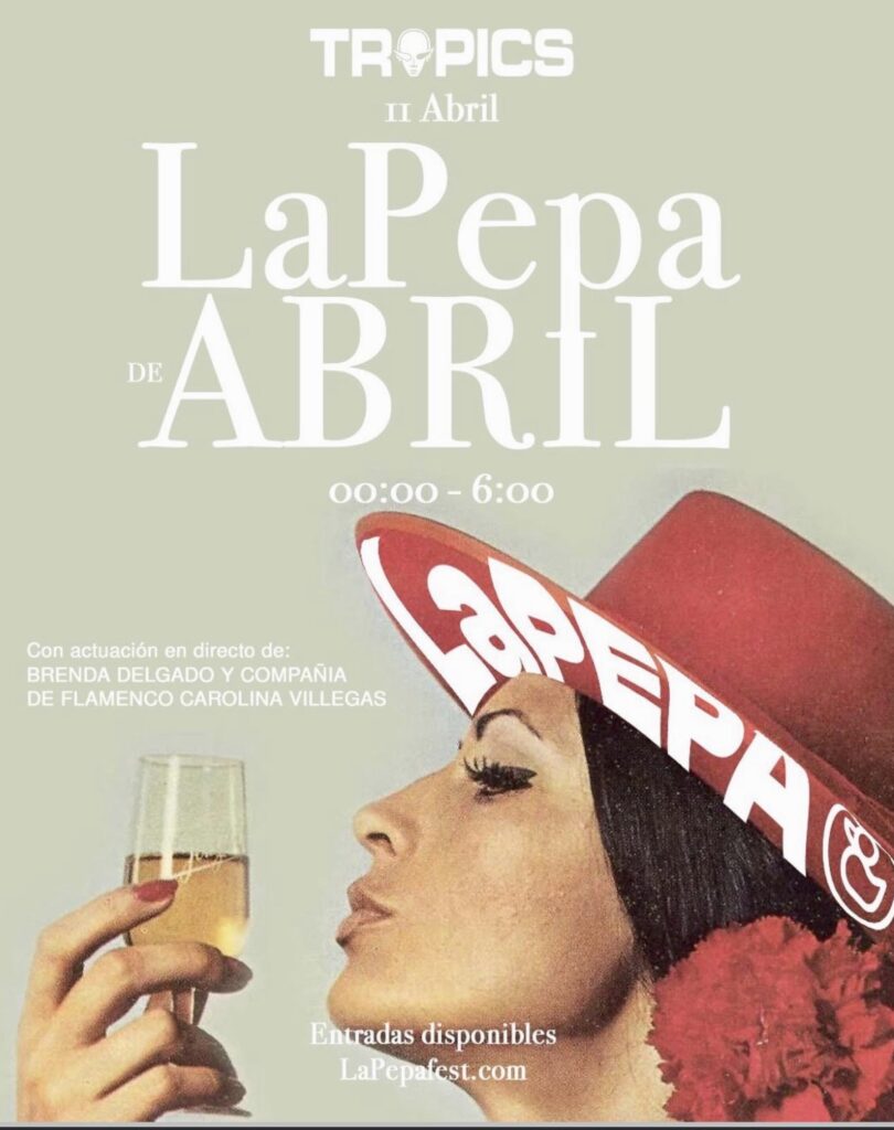 El sábado 11, la Discoteca Tropics acogerá “LaPepa de Abril”, una fiesta para los más atrevidos desde las 00:00 hasta las 6:00 con actuación en directo de Brenda Delgado y la compañía de flamenco de Carolina Villegas y un ambiente decorado al estilo andaluz. Entradas disponibles en LaPepafest.com. Solo para mayores de 18 años. Un plan para los más jóvenes que busquen una discoteca ambientada como nunca en color andaluz.