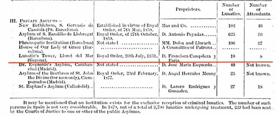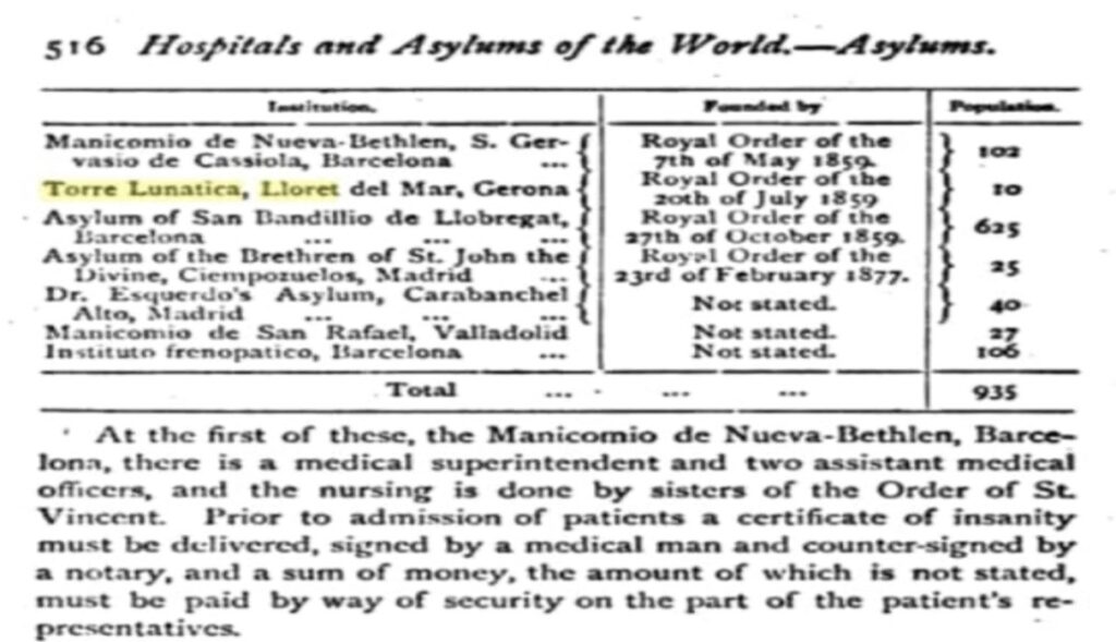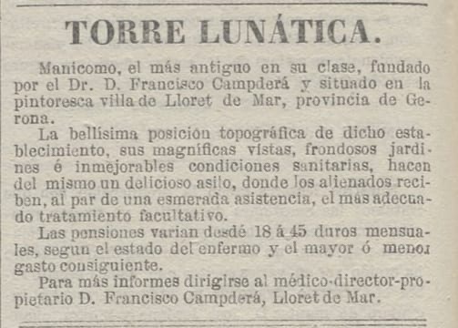 Nos referimos a “Torre Lunática”, primera clínica privada psiquiátrica en España, fundada en Lloret de Mar en el reinado de Isabel II (1833-1868), en 1844, por el médico y biólogo Dr. Francesc Campdera i Camin.