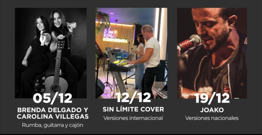 La agenda musical arranca este viernes 5 de diciembre con el dúo de Lloret: BRENDA DELGADO Y CAROLINA VILLEGAS, que traerán rumba, guitarra y cajón en una noche que apunta a puro arte “por los cuatro costaos”. El 12 de diciembre toma el relevo SIN LÍMITE COVER, con versiones internacionales que prometen despertar recuerdos a los asistentes. Y el 19 de diciembre, el artista JOAKO pondrá el broche final con versiones nacionales muy reconocibles para los más nostálgicos.
