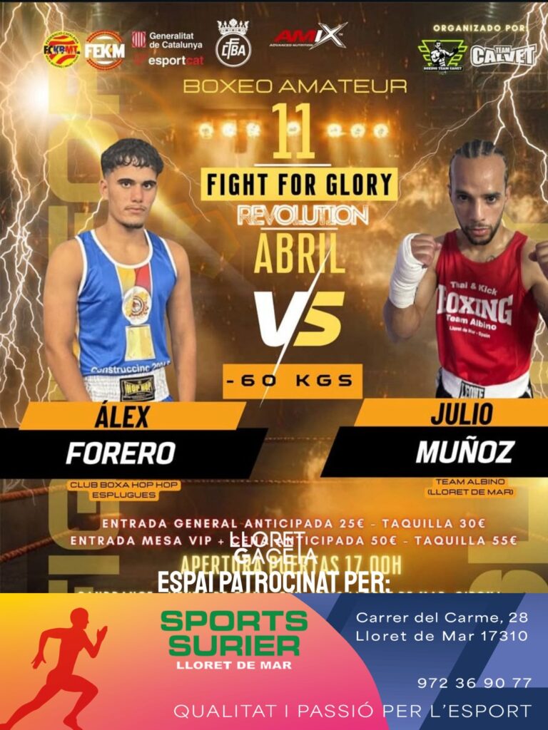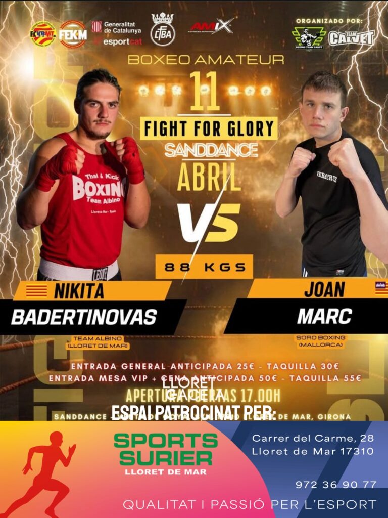 El proper 11 d’abril, Lloret de Mar acollirà una nova edició del “Fight for Glory”, on el Team Albino serà protagonista amb dos combats amateurs destacats; en la categoria de 88 kg, Nikita Badertinovas s’enfrontarà a Joan Marc en un duel de gran exigència, mentre que en -60 kg, Julio Muñoz buscarà imposar-se davant Álex Forero, en una vetllada que promet emoció i nivell tot i no estar organitzada directament pel club, sinó amb la seva participació activa.
