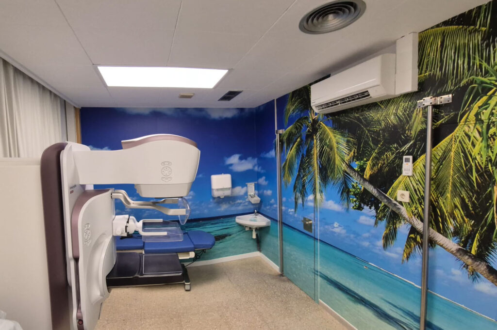 Coincidint amb la reforma del Servei de Radiologia de l’Hospital de Blanes, les sales de mamografia s’han decorat amb vinils de paisatges naturals i motius florals que evoquen tranquil·litat i benestar. Aquesta intervenció busca crear un entorn més càlid i acollidor per a les dones que s’han de sotmetre a proves diagnòstiques, contribuint a una experiència més positiva. En la mateixa línia, les sales de mamografies i ecografies de l’Hospital de Calella també s’han decorat, en aquest cas, amb un disseny marítim, amb l’objectiu de millorar el confort i el benestar emocional de les pacients.