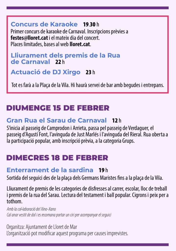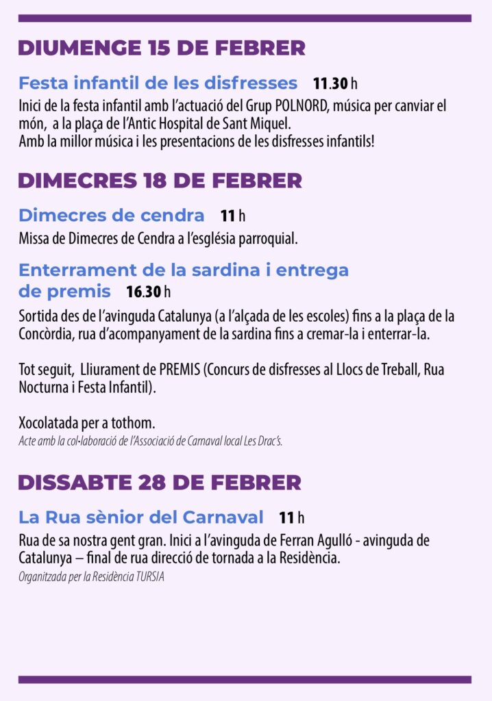 El diumenge 15 de febrer se celebrarà la Festa Infantil de Disfresses a les 11.30 h, a la plaça Sant Miquel, amb concurs i actuació de Pol Nord. La programació continuarà el dimecres 18 de febrer amb l’Enterrament de la Sardina, a les 16.30 h, amb premis i xocolatada per a tothom. Finalment, el dissabte 28 de febrer es posarà el punt final amb la 49a Gran Rua de la Ressaca del Carnaval, Sambòdrom, Festa After i entrega de premis, tancant així dues setmanes de celebració i disbauxa al municipi.