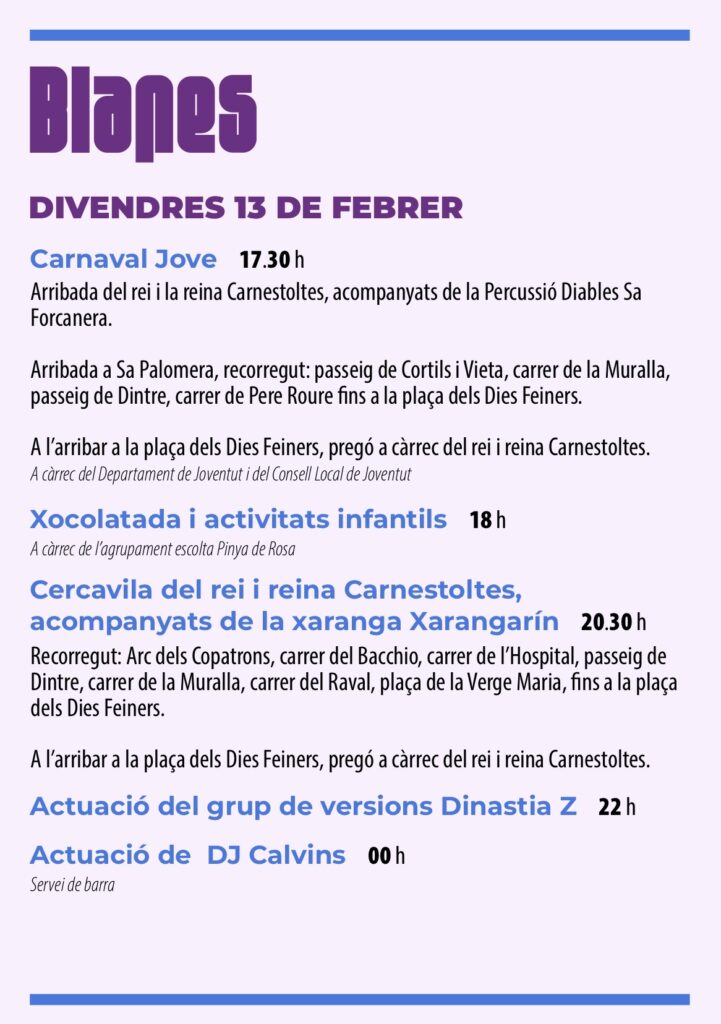 Al municipi on comença la Costa Brava els actes del carnaval s’encetaran la tarda-vespre del divendres 28 de febrer amb la Festa de Carnestoltes que ha organitzat el Consell Local de Joventut. A 2/4 de 8 arribarà el Carnestoltes amb la xaranga Band The Marxa, amb una cercavila que transcorrerà des de la roca de Sa Palomera fins a la plaça dels Dies Feiners.