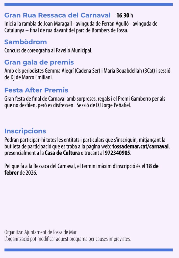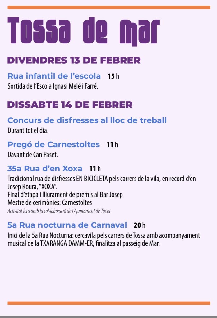 El Carnaval a Tossa de Mar se celebrarà del 13 al 28 de febrer, amb una programació diversa i pensada per a tots els públics. Els actes s’iniciaran el divendres 13 de febrer amb la Rua Infantil, a les 15 h, amb sortida des de l’Escola Ignasi Melé i Farré. El dissabte 14 de febrer tindrà lloc el concurs de disfresses al lloc de treball durant tot el dia, la 35a Rua d’en Xoxa a les 11 h —amb el pregó del Rei Carnestoltes i sortida des de Can Paset— i, al vespre, la 5a Rua Nocturna, a les 20 h, a la plaça de la Concòrdia, amb animació de la xaranga Damm-er.