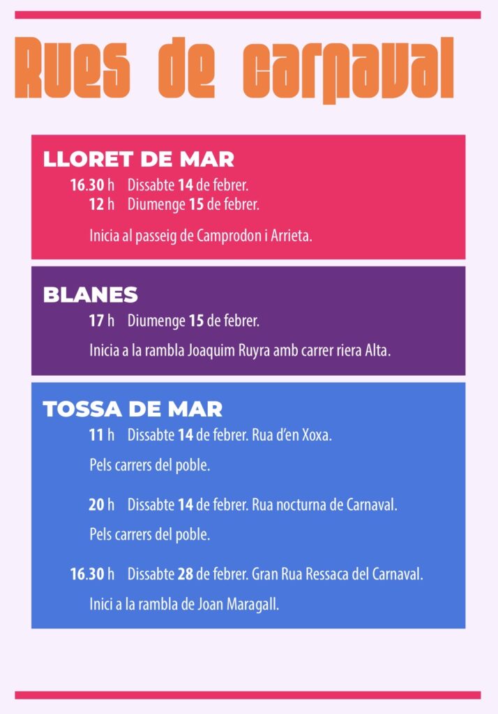 Lloret de Mar serà la primera població on hi haurà la Gran Rua de Carnaval, més concretament el dissabte 14 de febrer a les 16.30 h; l’endemà diumenge 15 de febrer Lloret de Mar torna a viure la rua a les 12 h i, ja a la tarda, serà el torn de Blanes, on la Desfilada de Carrosses i Comparses començarà a les 17 h. Finalment, Tossa de Mar acollirà la Gran Rua Ressaca del Carnaval el dissabte 28 de març a 16.30 h de la tarda.