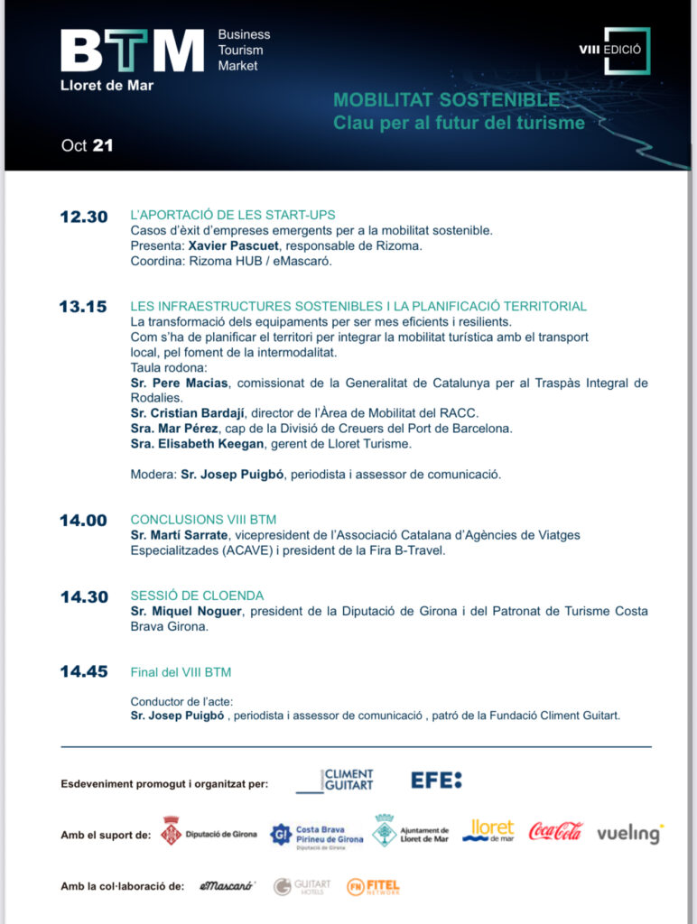 Aquest dimarts, 21 d’octubre, Lloret de Mar es converteix en epicentre del turisme de negocis amb la celebració de la vuitena edició del Business Tourism Market (BTM), que tindrà lloc a la sala Palas Atenea de l’Hotel Guitart Central Park Aqua Resort a partir de les 09.00h. Enguany, el fòrum posa el focus en la mobilitat sostenible com a clau per al futur del turisme, un tema que reuneix experts i autoritats per discutir solucions innovadores i pràctiques.