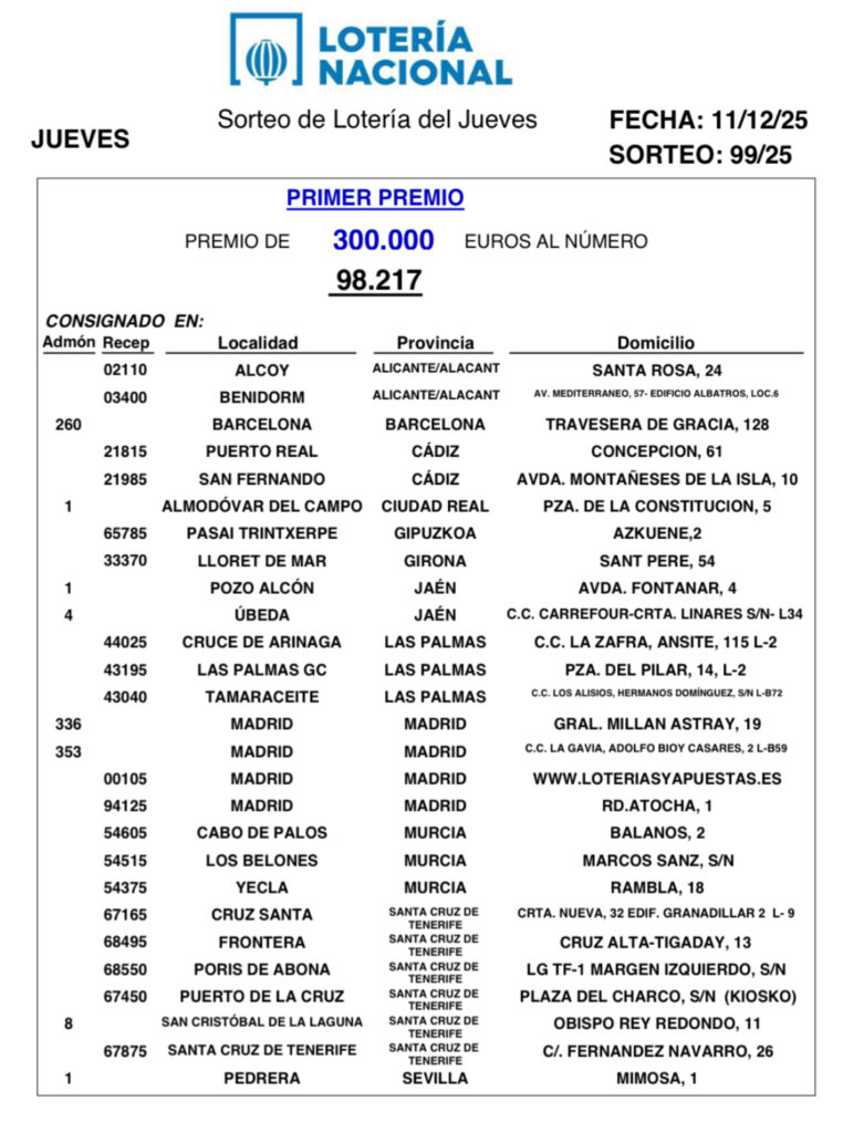 Cal recordar que un bitllet complet de la Loteria Nacional està format per 10 dècims. En els sorteigs dels dijous es posen a la venda 10 sèries, cosa que significa que de cada número (del 00000 al 99999) s’ofereixen 100 dècims en total. En el cas del 98217, això suposa que s’han repartit 3 milions d’euros en premis.