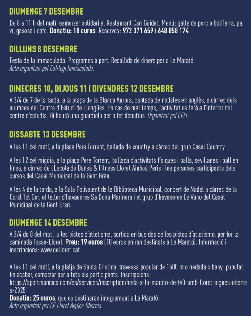 Des de l’organització es recorda que es pot fer un donatiu directe a 3Cat a través d’aquest enllaç, però Lloret posa la resta: activitats per a totes les edats i una resposta ciutadana que any rere any confirma que la solidaritat és marca de la casa.