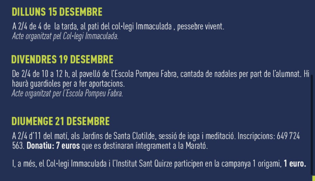De 9.30 a 12 h, cantada de nadales al pavelló de l’Escola Pompeu Fabra, amb guardioles per fer aportacions.