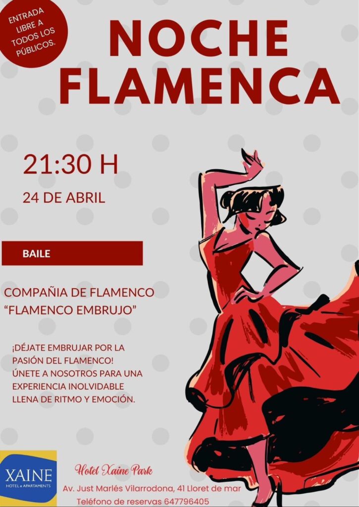 Entrada libre y sin necesidad de estar alojado. El próximo 24 de abril a las 21:30 h, el Hotel Xaine Park celebra una noche especial con la actuación de la compañía de flamenco “Flamenco Embrujo”. Una cita llena de duende para empezar la Feria de Abril con pasión. Dirección: Av. Just Marlés Vilarrodona, 41. Tel: 647796405.